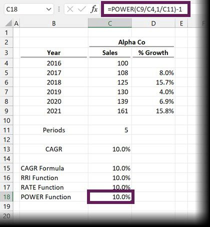 POWER function =POWER(C9/C4,1/C11)-1 in cell C18, returning 10.0%