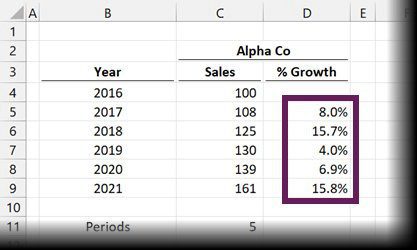 Scenario: only the annual % growth values (D5:D9) are available — no absolute sales figures
