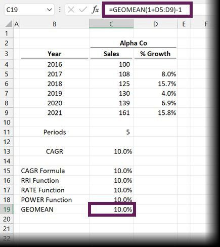 GEOMEAN formula =GEOMEAN(1+D5:D9)-1 in cell C19, returning 10.0%