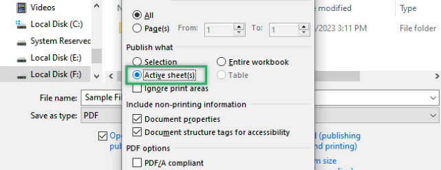 Step 9: Under the Publish what section, choose Active Sheets.