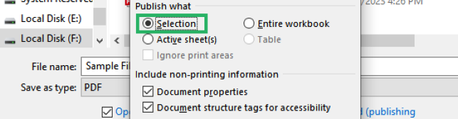 Step 3: The dialog box will show up, Choose Options, Under the “Publish what” option, choose “Selection.”