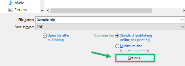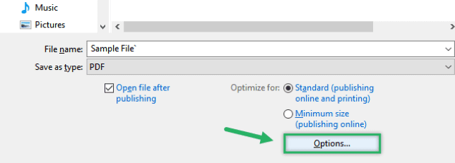 Step 2: The dialog box will show up. Under “Save as type,” click Options.