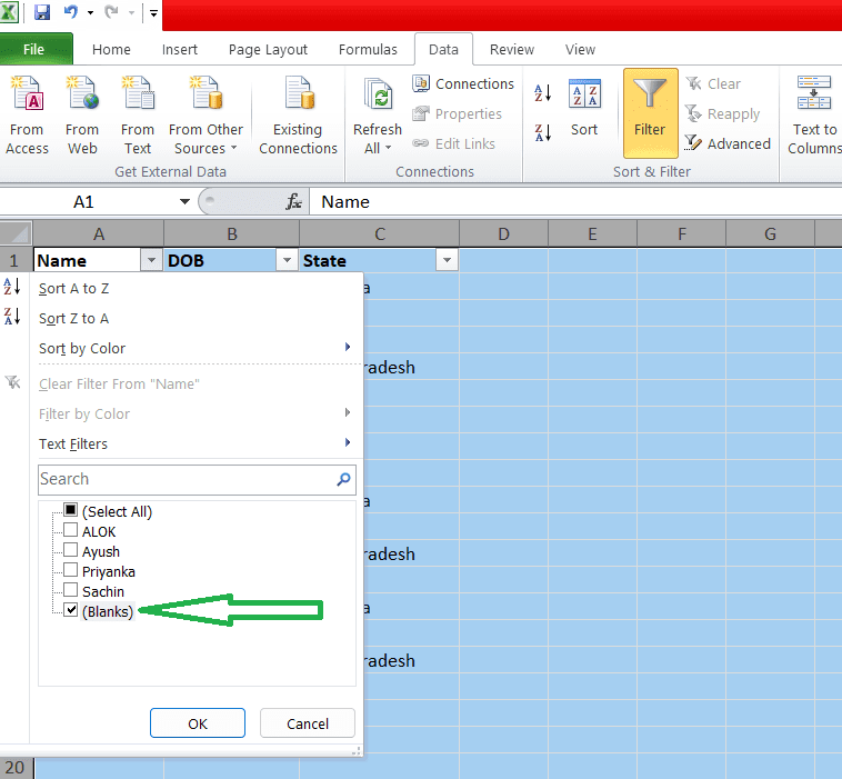 Step 3: Filter Blank Rows: Click the filter arrow, then uncheck “Select All.” Then scroll to the bottom of the list and select the ‘Blanks‘ option. Click ‘OK‘.