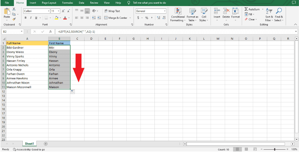 Step 2: Use the SEARCH and LEFT functions to make a combination that gets the first name from a certain source.