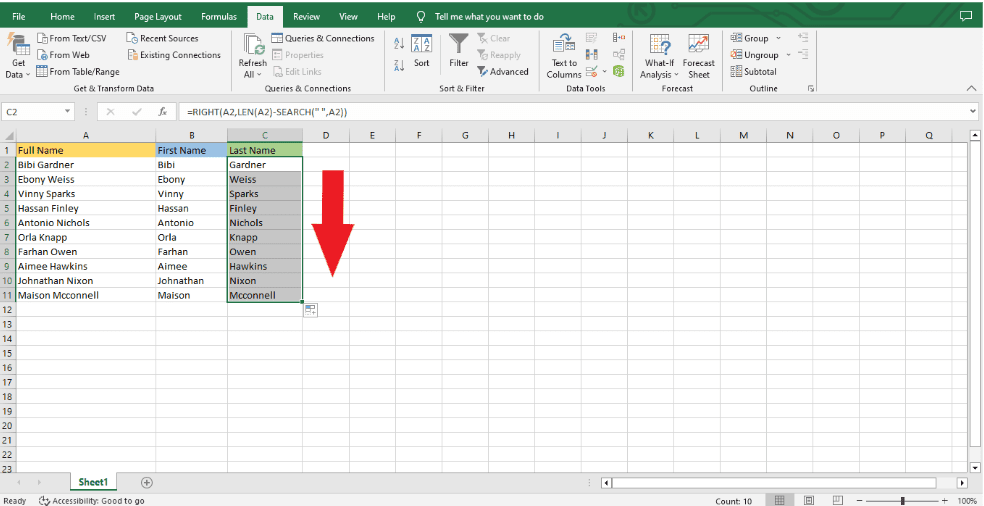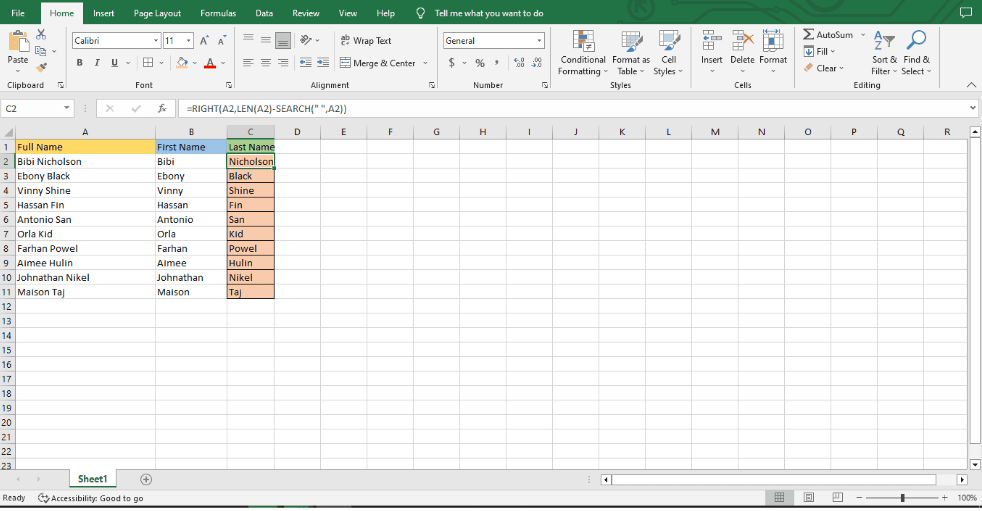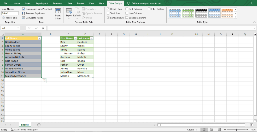 Step 1: Decide what kind of split you want to add to the data. I chose an example where the first and last names are separated by one space to make it easier to show.