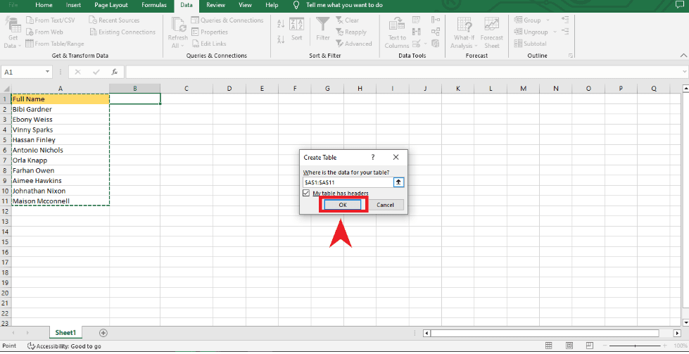 Step 2: If the cell you chose is not part of an Excel table, a Create Table window will open. Make sure that all of the rows and columns are selected and that the “My table has headers” box is checked before you click OK.