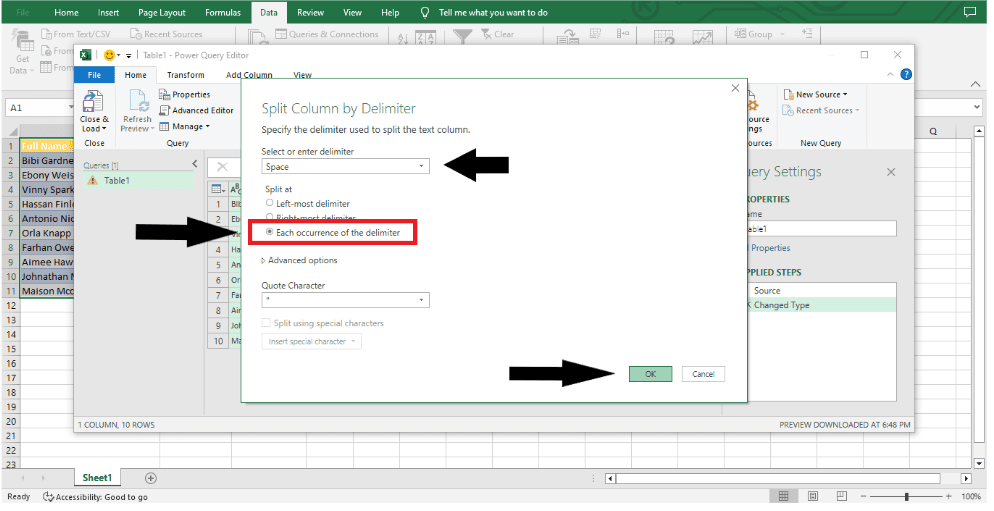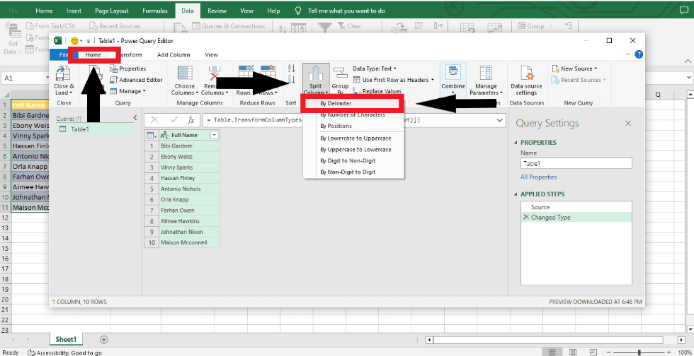 Step 3: Open the Power Query editor to see all of your data. Then, on the ribbon, go to Home > Split Column (drop-down) and choose By Delimiter to start.