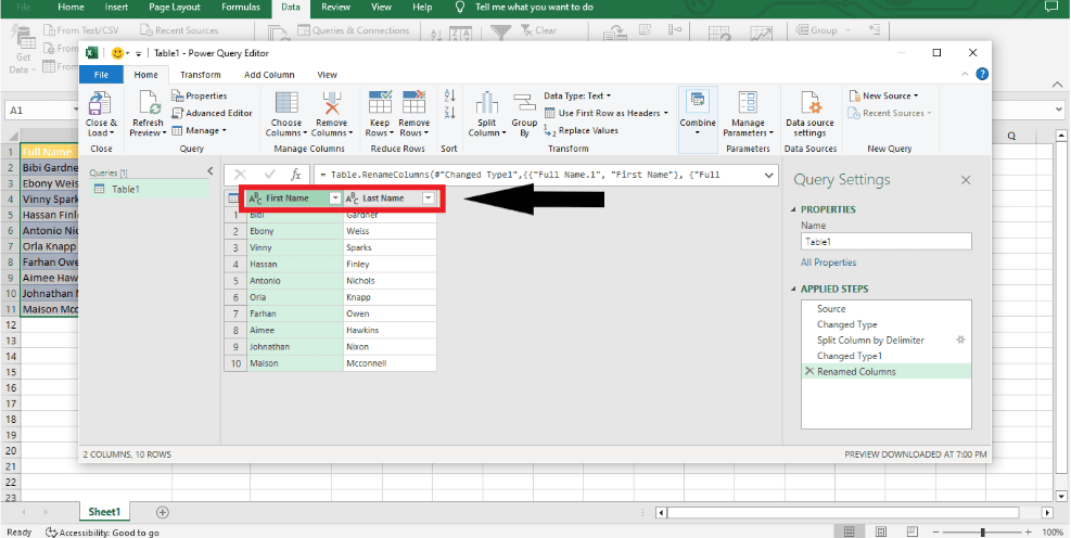 Step 5: You can now see that the names are split into two columns in the data preview window. To make them easier to find, double-click on the header and change it to “First Name” and “Last Name.”