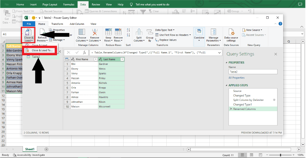 Step 6: Now you need to send the data back to Excel. To achieve this, go to Home > Close & Load (the drop-down menu) and then choose “Close & Load To…”.