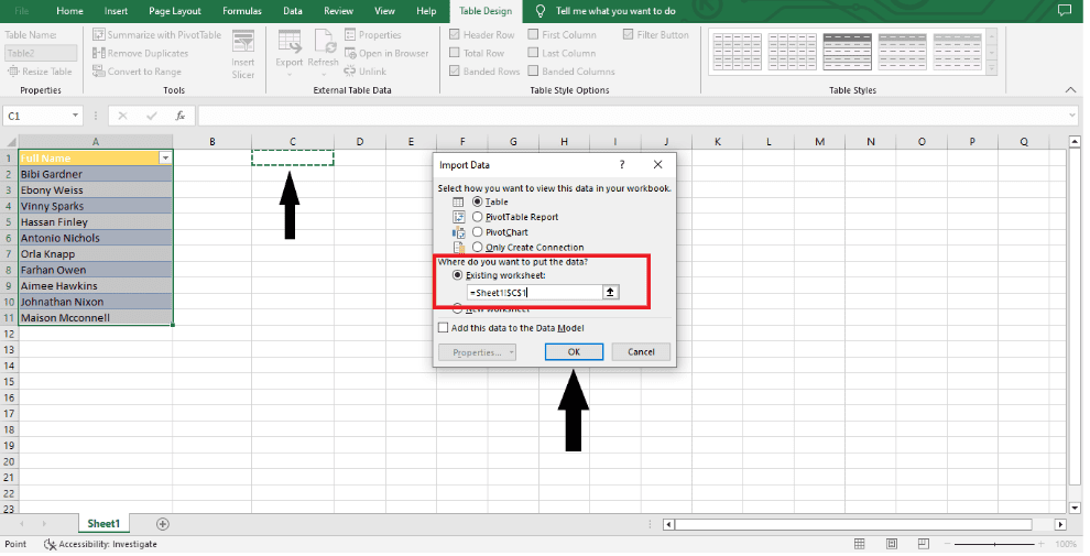 Step 7: In the Import Data dialogue box, click Table and then pick where you want to load the data. I have chosen an existing sheet at cell C1 in the example. Hit OK.