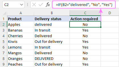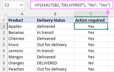 | Case-sensitive text | =IF(EXACT(B2,”DELIVERED”), “No”, “Yes”) |