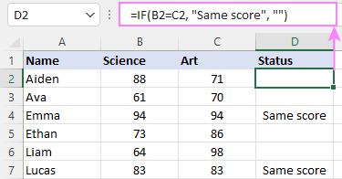 Use the equals sign in the logical test to compare two cells. For example, to check if two scores match: