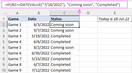 =IF(B2>DATEVALUE("7/18/2022"), "Coming soon", "Completed")