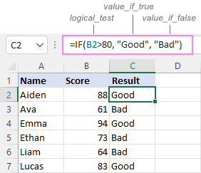 Basic IF formula: =IF(B2>80, “Good”, “Bad”) — returns “Good” for scores above 80, “Bad” otherwise