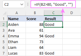 =IF(B2>80, "Good", "") ← returns blank when condition fails (best practice)
