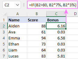 IF running different calculations: scores above 80 earn a 7% bonus, others earn 3%