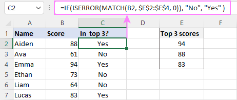 This formula checks whether each score in column B matches any of the top 3 scores in E2:E4. It returns ‘Yes’ if a match is found, ‘No’ if MATCH throws an error (no match).