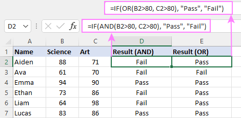 =IF(OR(B2>80, C2>80), "Pass", "Fail")