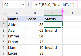 | Check negative number | =IF(B2<0, “Invalid”, “”) |