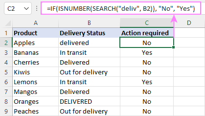 | Partial text match | =IF(ISNUMBER(SEARCH(“deliv”,B2)), “No”, “Yes”) |